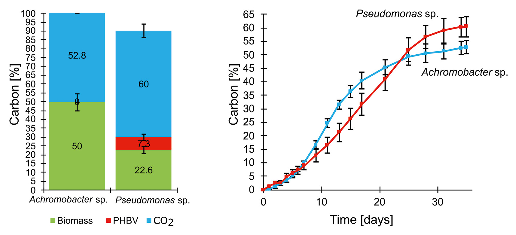 The experiments showed that PHBV could be completely decomposed under optimal conditions. Achromobacter fully degraded the plastic, while Pseudomonas left a residual fraction of less than 10 % (Figure 3). The method precisely documented the degradation process and provided valuable insights into how different bioplastics respond under specific conditions.