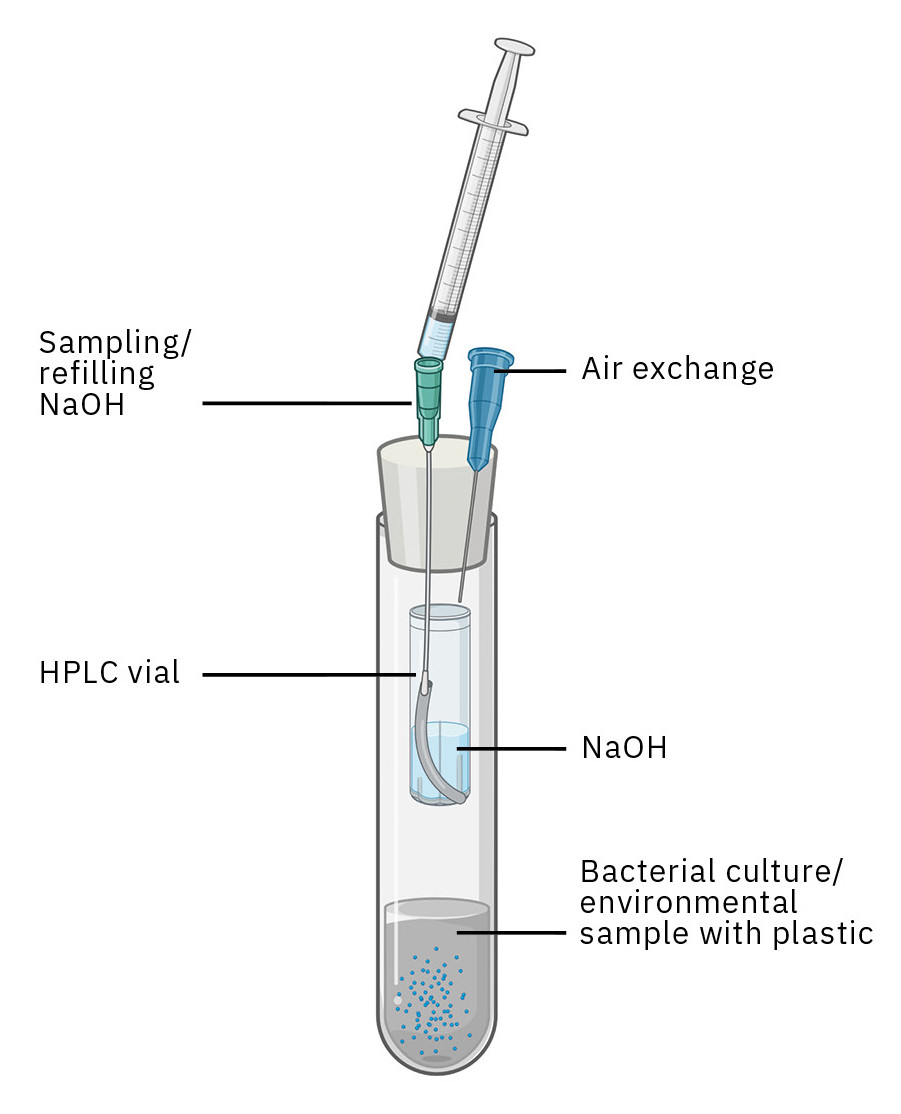 Central to the method are custom-made reaction vessels made from 15-mL culture tubes (Figure 1). Each tube holds roughly 50 mg of bioplastic along with 1 g of biological material, such as soil samples or bacterial cultures. In the tube is a small glass vial containing a sodium hydroxide (NaOH) solution, which chemically captures the CO₂ produced during the degradation process as carbonate.