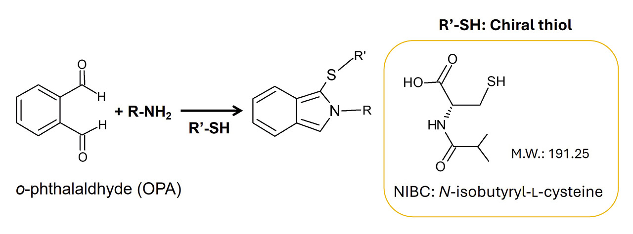 The method investigated in Natsuki Iwata’s study was based on a derivatization reaction of o-phthalaldehyde (OPA) and the chiral thiol N-isobutyryl-L-cysteine (NIBC), followed by analysis using liquid chromatography. The pioneering work in this area was done by Euerby et al. in the late 1980s. [2–7] In those studies, different chiral thiols were synthesized and investigated after manual derivatization with OPA on a reverse phase of HPLC allowing the separation of D- and L-enantiomers of several amino acids.