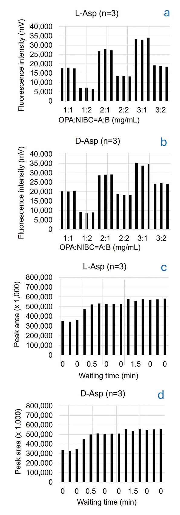 To promote the derivatization reaction and obtain good repeatability, a constant waiting time after mixing the OPA/NIBC solution and the sample within the injection needle of the autosampler was introduced into the pretreatment program. Five different waiting times were examined in advance. As the peak area was constant after 1.5 minutes or more, the waiting time was set to 1.5 minutes (Figure 3c and 3d).