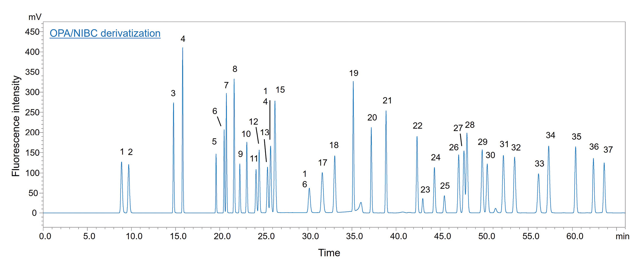 A new method has been developed for the simultaneous separation of 37 OPA/NIBC-derivatized D- and L-amino acids using a straightforward UHPLC system. This method achieves processing results in about half the time required by conventional techniques via a single analysis with automated sample handling and streamlined data.