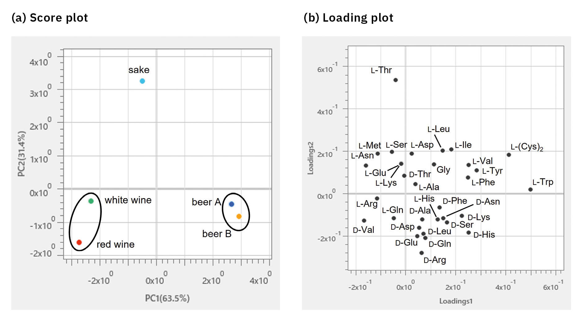 A PCA was performed using the content of each compound (n = 4) in beverages (Figure 6). As a result of the PCA, beer A and beer B were plotted close together on the score plot as well as red and white wines. It was also found that sake showed different characteristics from these beverages. The loading plot revealed that the two kinds of beer as well as the red and white wines contained many D-isomers, while the sake was rich in L-isomers. In particular, L-Trp, D-His and D-Lys contributed significantly to the two kinds of beer, D-Val to the red and white wines and L-Thr to the sake. This suggested that the first principal component (PC1) showed differences in the types of beverages, while the second principal component (PC2) revealed differences in the isomers.