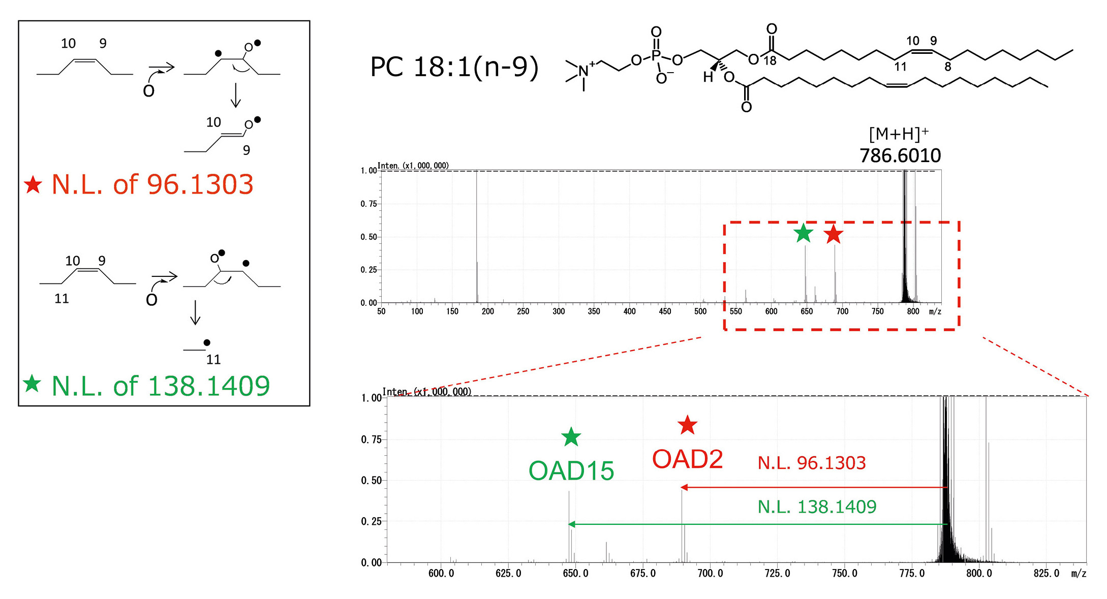 In targeted analysis, these predicted OAD neutral losses can be preregistered in a compound table, and extracted ion chromatograms (XICs) can be used to differentiate structural isomers. Moreover, when collision energy (CE) is applied simultaneously in OAD, CID-type neutral losses of acyl chains can also be detected.[7] These neutral losses enable the identification of acyl chain length and the number of C=C bonds.[8] Thus, the combination of OAD- and CID-derived fragments allows comprehensive structural elucidation of lipids, including C=C positional information.